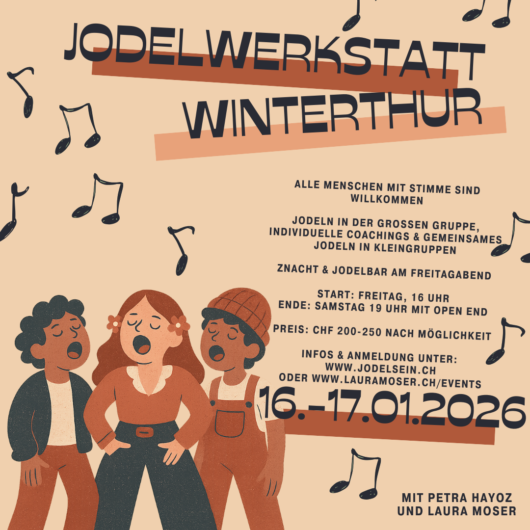 Winti Jodelwerkstatt mit Petra Hayoz und Laura Moser Der Kurs ist ausgebucht! Wenn du auf die Warteliste möchtest, melde dich einfach an. Du erhältst dann per Mail Bescheid, sofern kurzfristig ein Platz frei wird. Zeit und Ort: 16. Januar 2026, 16 Uhr bis 17. Januar 2026, 19 Uhr (mit open end) Quartiertreff Wildbach, …